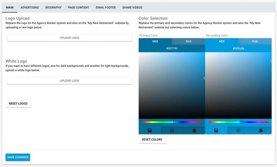 Pro Branding gives agents full control over how their "My New Retirement" experience looks and feels. Customize your personal website and the entire Agency Rocket interface with your own logos and brand colors for a consistent, professional presence. You can also add advertising tracking pixels to your site for better campaign insights, and personalize the signature on all automated emails sent through the system—ensuring every touchpoint reflects your unique brand.