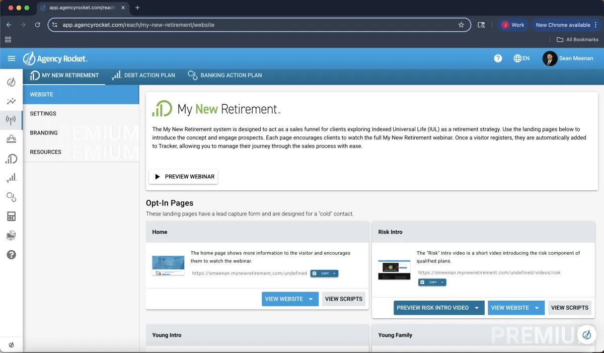 Reach is a powerful prospecting system designed to attract, educate, and guide leads toward securing an Indexed Universal Life (IUL) policy. It features personalized agent landing pages, lead capture forms, professional teaser videos, an educational webinar, and the Savings Snapshot system, all integrated into My New Retirement. With seamless Tracker integration, Reach automates marketing and follow-ups, helping agents convert prospects efficiently.